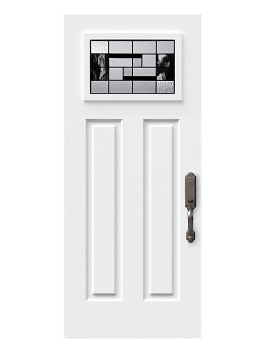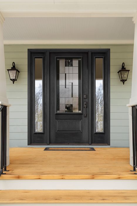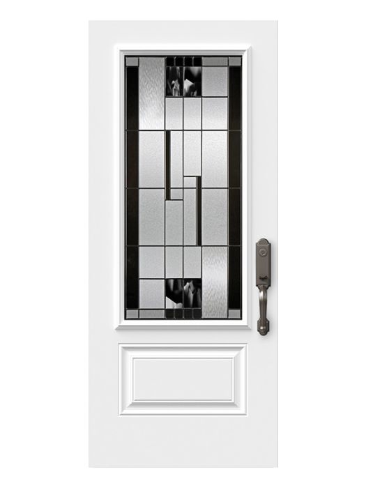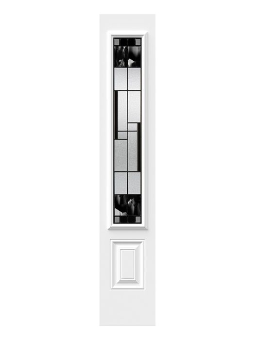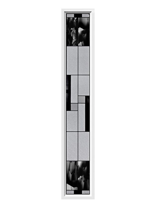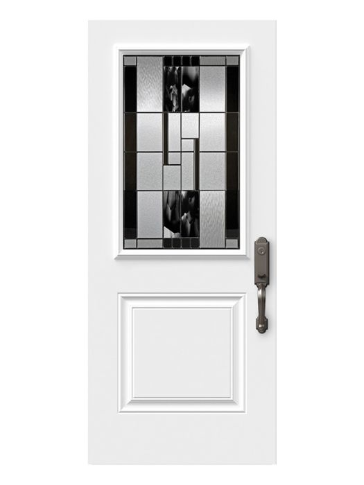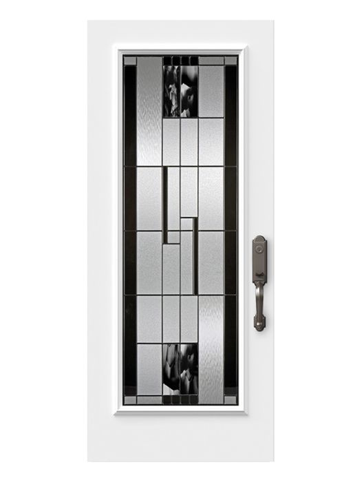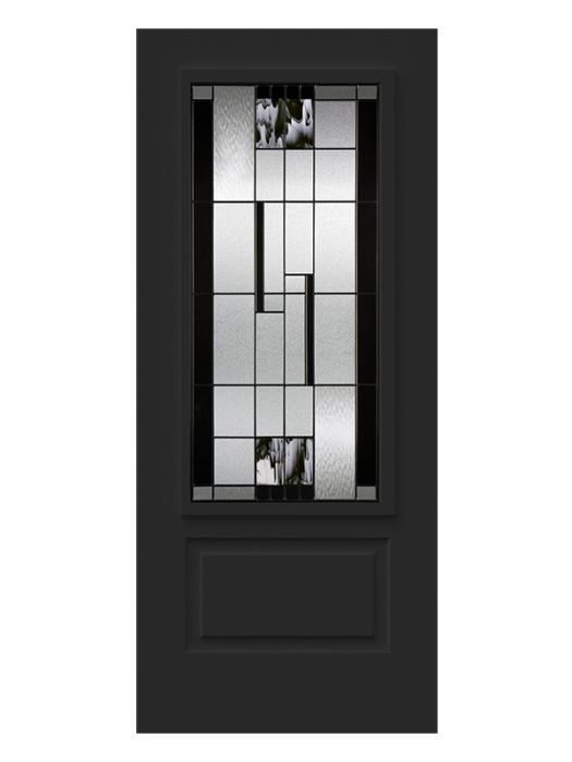 Onyx, with its contrasting details and black baroque glass, is a true masterpiece. Including handmade pieces of artfully blended black and clear glass, each panel offers a unique, exclusive look. Onyx serves as an artistic focal point for entryways in transitional or modern style homes.