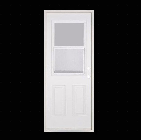 PreHang Fiberglas Smooth Half Lite Ventlite over 2-Panels Raised Prehung on 4-9/16" Exterior Smooth Composite Jamb, White Weatherstrip, Alum Mill Sill, Satin Nickel Hinge, Double Bore